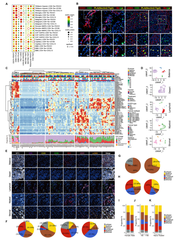 通过CellPhoneDB分析细胞间配体-受体互作,发现NECTIN2-TIGIT是跨癌种广泛存在的免疫抑制信号轴,尤其在成纤维细胞/内皮细胞与T细胞之间作用显著。该互作经邻近连接技术(PLA)在组织中原位验证,提示其作为泛癌种脑转移免疫治疗新靶点的潜力。